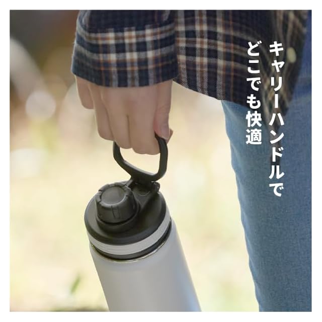 アメリカ カリフォルニア・ハンティントンビーチ生まれのThermoFlaskがリニューアル!スリム&軽量化でさらに快適に! ◆保冷専用直飲みタイプです。 ◆真空断熱ステンレス構造で、保冷力抜群の保冷専用ステンレスボトルです。 ◆底部を衝撃から守るシリコーンバンパーは標準装備でファッショナブルな仕様です。 ◆本体は、濡れていても滑りにくくキズに強い塗装仕様です。 ◆持ち運びに便利なキャリーハンドル仕様です。 ◆飲み口はPETボトルの使用感で開閉できます。 ◆食器洗い乾燥機のご使用はお避けください。 ご使用前には取扱説明書をよくお読みください。 ●容量:1.17L ●商品重量:約456g ●商品サイズ: ハンドルダウン時 幅85mm×奥行90mm×高さ300mm ハンドルアップ時 幅85mm×奥行85mm×高さ340mm ◎本体 ◆アウター:ステンレス鋼 ◆インナー:ステンレス鋼 ◎フタユニット ◆フタ:ポリプロピレン ◆ネジキャップ:ポリプロピレン ◆ハンドル:ポリプロピレン ◆シリコーンリング:シリコーンゴム ◆ネジキャップパッキン:シリコーンゴム ◆フタパッキン:シリコーンゴム ◆軸:ステンレス鋼 ◎バンパー ◆シリコーンバンパー:シリコーンゴム ●原産国:中国