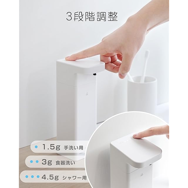 【自動ソープディスペンサー 液体】料理中、ベタベタの手でポンプをプッシュするのがストレスでした。キッチンには食器洗剤を入れて、スポンジをかざすだけで定量が出るのでとても楽。シーンに合わせてソープの量は三段階に調節ができるので使いすぎの予防になります。