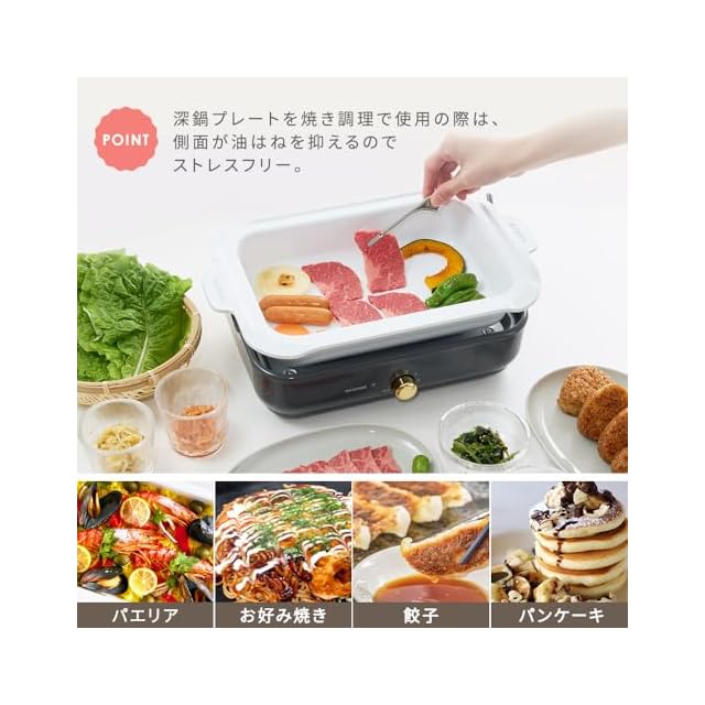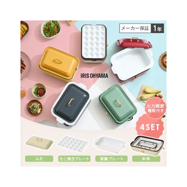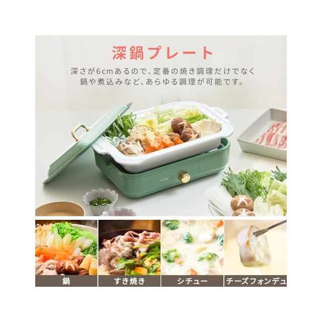 【深鍋プレート】深さがあるので、鍋やおでん、野菜たっぷりのポトフなどの料理に最適です。蓋つきなので、お好み焼きや餃子にも使えます。【たこ焼きプレート】定番のたこ焼きやアヒージョ、一口ケーキポップなどを作ることができ、パーティーでも大活躍です。