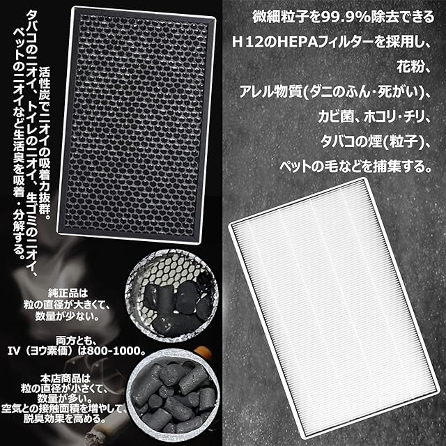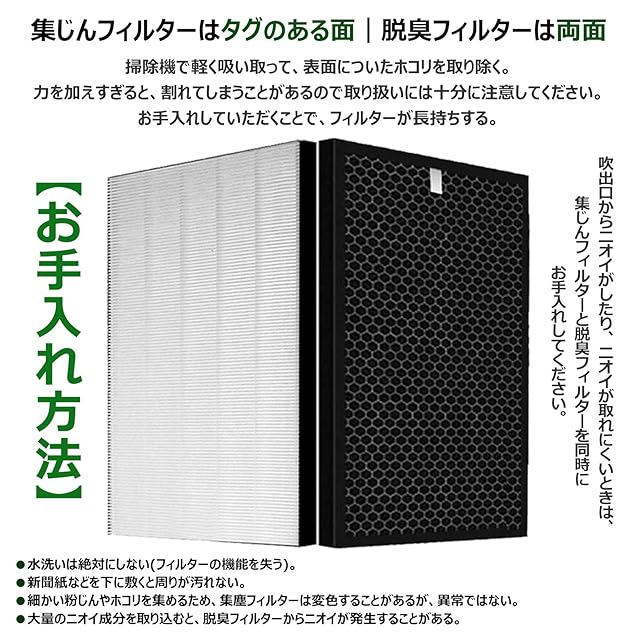 【性能】集塵フィルターは微細粒子を99.9%除去できるH12のHEPAフィルターを採用し、花粉、アレル物質(ダニのふん・死がい)、カビ菌、ホコリ・チリ、タバコの煙(粒子)、ペットの毛などを捕集する。脱臭フィルターは活性炭でニオイの吸着力抜群。タバコのニオイ、トイレのニオイ、生ゴミのニオイ、ペットのニオイなど生活臭を吸着・分解する。使い捨てプレフィルターはホコリ、ペットの毛、タバコのヤニなど、空気中の大きな粒子をキャッチする。集塵フィルターと脱臭フィルターの使用寿命を延長する。また、後ろパネルのお掃除いらず、簡単に貼ってはがせる。安全で環境にやさしく、経済的で実用性がある。