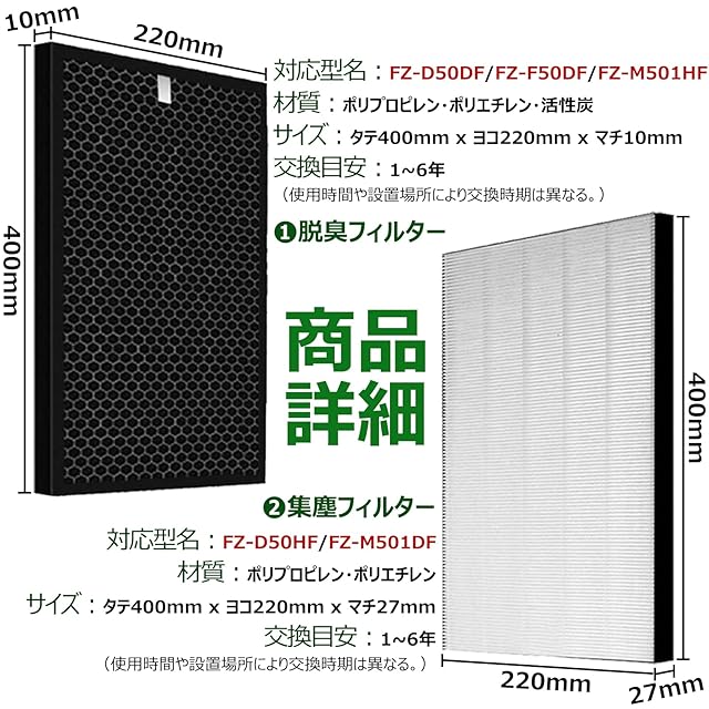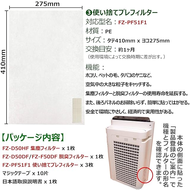 【形名】集塵フィルター FZ-D50HF ( FZ-M501HF ) / 脱臭フィルター FZ-D50DF ( FZ-F50DF / FZ-M501DF ) / 使い捨てプレフィルター FZ-PF51F1 。材質:ポリエステル・ポリプロピレン。