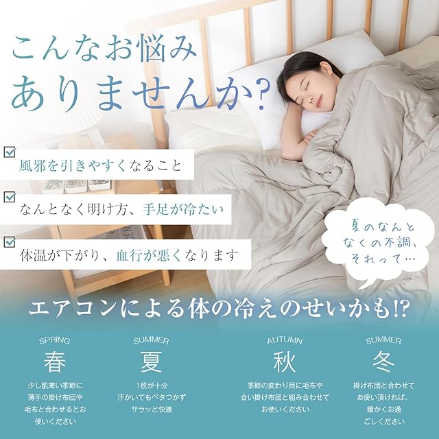 【オールシーズン活躍】この肌掛け布団は、程よい保温力で暑くなりすぎないため、夏場の冷房による冷え防止にもぴったりです。寒い冬に掛け布団だけでは暖かさが足りない場合の併用や、春秋の季節の変わり目にタオルケットと組み合わせても使用いただけます。一年中快適にお使いいただけるアイテムです。