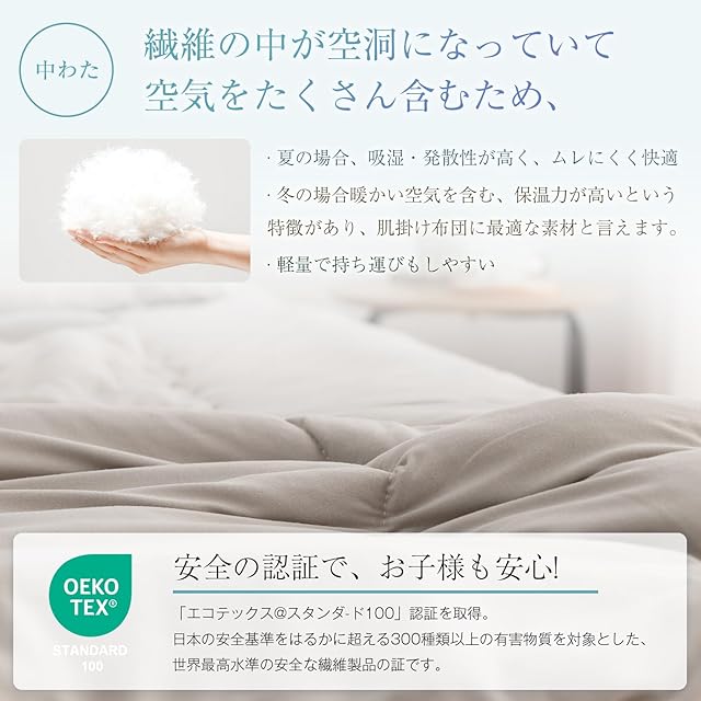 【大豆繊維とTEIJINの中空ポリエステル綿使用】大豆繊維は水分が少ないため、細菌やダニの繁殖環境がないことで、それらの繁殖を効果的に抑制し、アレルギーの方にも優しい繊維です。また、吸湿速乾性に優れ、UVカット効果もあります。TEIJINの中空ポリエステル綿は、中空構造によって空気を含むことで、通常のポリエステル綿よりも軽く、保温力と通気性に優れています。洗濯後の乾きが早く、抗菌防臭機能もある優れた繊維です。