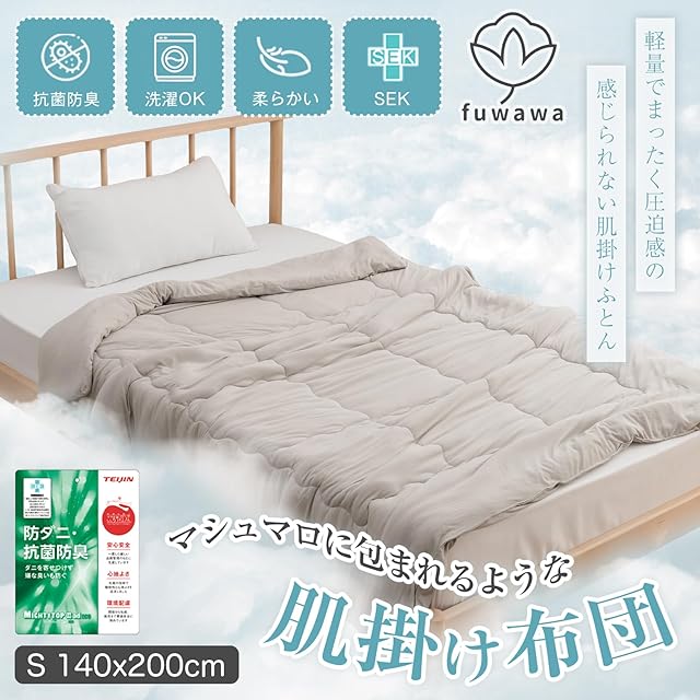 商品名:fuwawa 掛け布団 シングル 夏用 肌掛け布団 オールシーズン キルトケット 夏布団 肌布団 軽量 850g 天然素材 TEIJIN中空ポリエステル綿使用 抗菌防臭 防ダニ 春用 秋用 子供 冷房対策 かけふとん カバーなしでもOK 洗える 140x200 グレージュ