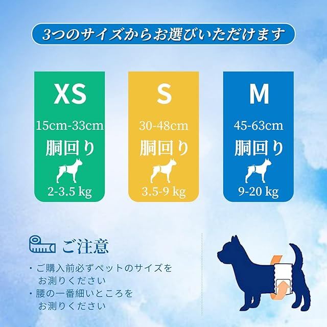 製品仕様:XS、S、Mの3つのサイズからお選びいただけます、ご購入前、必ずサイズ表で愛犬のサイズを確認してください、XS本体1枚のサイズ:約42x17.5x0.3cm、吸収部分約20x8cm、対応胴回り:約15-33cm、S本体1枚のサイズ:約53×20×0.3cm、吸収部分約20x10cm、対応胴回り:約30-48cm、M本体1枚のサイズ:約65×20×0.3cm、吸収部分約:20x10cm、対応胴回り:約45-63cm、マジックテープ式なので、固定用のマジックテープは大きくて、愛犬に適切なサイズに調整できます、伸縮性の縁で、わんちゃんの動きにもピッタリフィットします