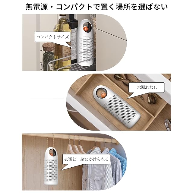 立つ、吊す、置く3wayでお使いでき、場所を選ばず、利便性を高めます。また、小型コンパクトのサイズ感で、スペースを取らず、狭い空間でも置かれ、周りのインテリアにも馴染みやすいです。食品保管庫、本棚、靴箱、カメラケース、バス用品の棚、衣類の引き出しなど様々なシーンで活用できます。約14500個(約250g)のシリカ乾燥粒子が内蔵されており、各粒子は数千万個の極々小さいホールで満たされ、 空気中の水分子を素早く吸着し、強力な除湿機能を達成します。除湿器に透明な窓が付いており、色変化により除湿具合が一目瞭然です。オレンジ色の場合は乾燥状態と示し、グリーン色の場合は吸湿中の状態と示し、濃いグリーン色は完全吸水の状態と示します。また、乾燥スタンドで、粒子を急速に加熱し、水分を還元させます。オレンジに戻ると、再び使用できます。除湿ボトルが2本付属されているので、二つの所の除湿が同時に行えます。1本の除湿ボトルの除湿量は最大100mlに達し、対応面積の目安は約3畳となります。クローゼットなどの少し広めのスペースもピッタリ適します。また、ゴミも水も出ないエコフレンドリーな除湿器なので、面倒な水捨て・水拭き・ゴミ処理から解放できます。乾燥ベースに置いて2時間で急速に乾燥できます。2時間後、加熱が自動的停止し、白いランプの点滅より終了をお知らせします。過熱による事故を防ぎ、外出中や眠り中にも心強くご利用いただけます。また、除湿器が稼働する時に、ほぼ無音で、夜でもぐっすりと眠れられます。