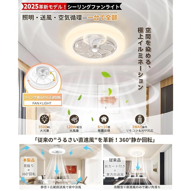 【3in1多機能・首振り&360°回転】TENKOO&YOUシーリングファンライトは、「照明・送風・空気循環」の3機能を一体化。3500LMの大光量と120W相当の強風量で、広い空間を明るく照らしながら効率的な送風を実現。前カバー不要設計で風量を41%向上させ、35dBの静音運転を可能にしました。さらに360°回転&首振り機能で従来比2倍の空気循環効率を達成。一台で家中の広範囲送風を実現し、快適な空間を創出します。