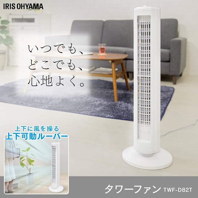 【節電対策】 アイリスオーヤマ 扇風機 タワーファン スリム 左右自動首振り パワフル送風 風量3段階 上下ルーバー メカ式 ホワイト TWF-D82T