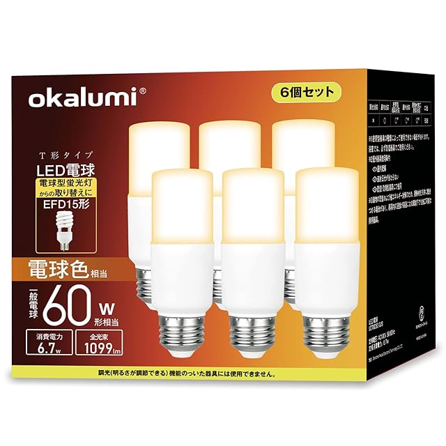 商品名:okalumi LED電球 E26口金 T形タイプ 60W形相当 電球色 1099lm 断熱材施工器具対応 全方向タイプ 電球型蛍光灯 EFD25・EFD15形代替推奨 風呂 キッチン 洗面所照明 ledライト 6個セット