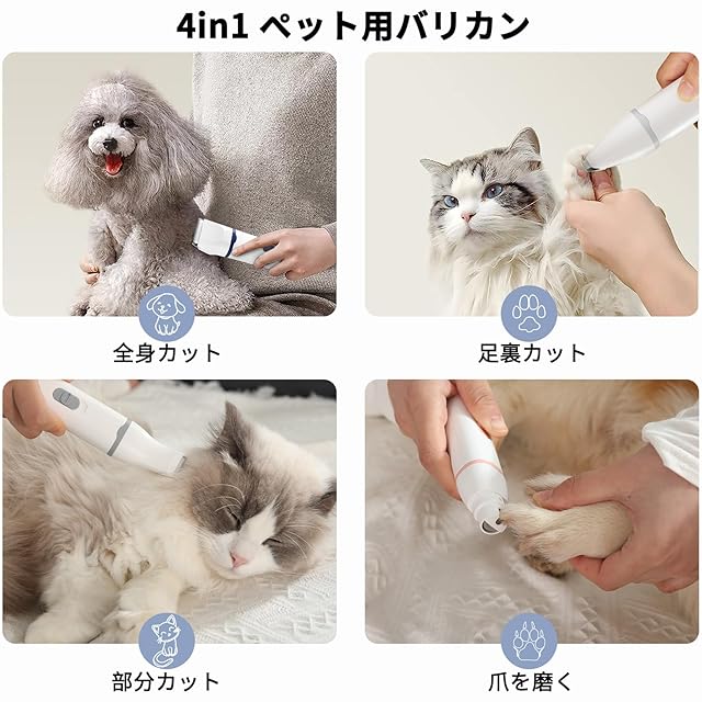 【4in1ペット用バリカン&多機能】犬用バリカンは取り換えできる4つのトリミングヘッド(全身をカットするヘッド、部分カットするヘッド、足裏をカットするヘッド、爪を磨くヘッド)が備えていて、犬や猫、ウサギなどの動物の全身や足裏、爪、耳裏、顔回り、お尻などの毛をカットすることが可能。猫用バリカンのヘッドの取り替えがとても簡単で、便利です。