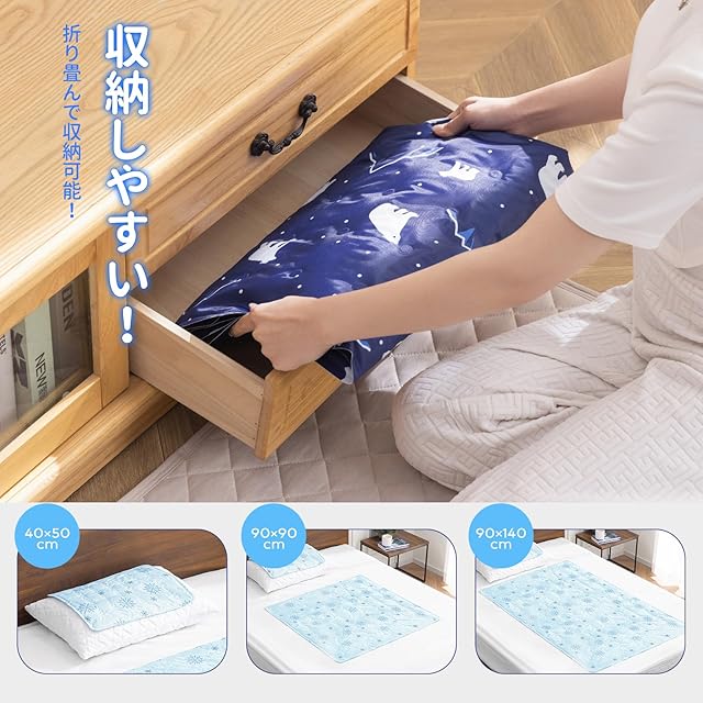 【多様な場合で使える・お手入れ簡単】サイズの種類が多いので、枕、ベッド、ソファーや椅子などに多様な場所で使える。家のどこにいても涼しく感じられ、寝返りの時、体が触れていない部分は冷却が進み、ひんやりが早速復活!折り畳めるので、収納しやすい。防水生地を採用しているので、汚れてしまった場合でも、湿られる布で拭いて簡単にきれいになり、いつも清潔に保てる。
