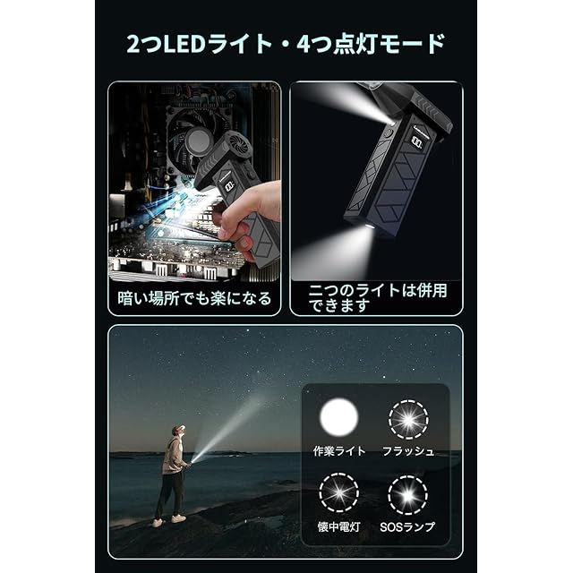 【2つのLEDで強力な照射!これ一台で完璧!】 ✅■通常のエアダスターとは異なる圧倒的な明るさを誇るダブルLEDが上下に搭載されており、暗い隅々や小さな隙間も昼間のように照らし出し、清掃の手間を簡単に解消します! ✅■この多機能ライトは手持ちライト、懐中電灯、防災用、キャンプ用としても活用可能。停電や緊急時はもちろんのこと、アウトドアでも大活躍します。 ✅■LEDの切り替えも簡単です。照明スイッチを長押してハンドル前の作業ランプをオンにして、再度長押してOFFにします。照明スイッチを1回押すとハンドルの底のランプが高輝度-高速点滅-低速点滅-OFFの3つのライトモードを切り替えます。