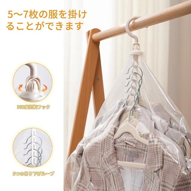 大容量:吊るせる衣類圧縮袋のフック部分は360度回転可能で、服を収納する時に掛けやすいです。そして、圧縮袋のホック部分に五つの吊り下げループがありますので、5枚以上の服が掛けます。圧縮袋が透明ビニールの材質なので、中身を一目だけでわかって、服探すにも便利です