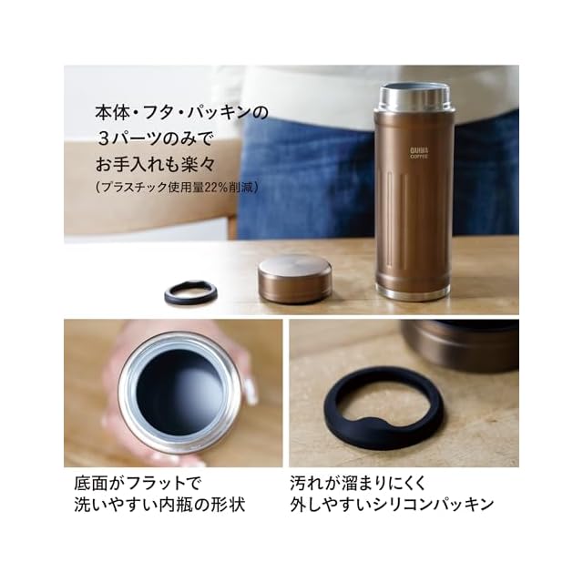 【お手入れ簡単】ボトル本体、フタ、パッキンの3パーツのみなので、お手入れも楽々。ボトル内面もテフロン加工で、底も洗いやすい形状です