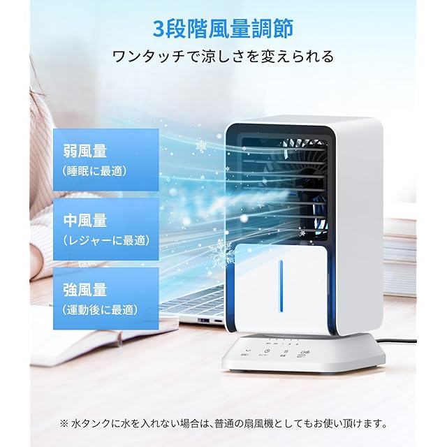 ❄【涼しさ選べる3WAY】1.送風:通常は扇風機のような感覚で送風運転。2.:風+水:もっと涼しさが欲しい時には水を入れ涼風運転。3.:風+水+氷:さらに暑い時には、氷を入れて、冷却効果はもっと強くなります。タンクの中に水を入れると、送風と同時に、繊細なミストも噴出されます。十分な風量を確保しながら加湿効果があり、自然の涼風で体に優しいのでクーラーの風が苦手な方に最適です。