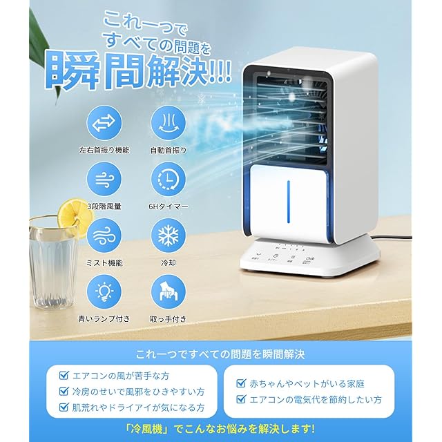 Wasuka 冷風機 小型 冷風扇 卓上冷風機 卓上 【NEWモデル 一台4役】 自動首振り タイマー機能付き ライト付き 「4in1機能搭載」 送風 加湿機能 冷却機能 空気清浄機能 強力 ミニクーラー 風量3段階調整 氷いれ可能 自動電源オフ保護機能 ミニ冷風扇 ミニエアコンファン コンパクト 省エネ 軽量 人気 熱中症対策 オフィス 寝室 日本語説明書 一年 ホワイト