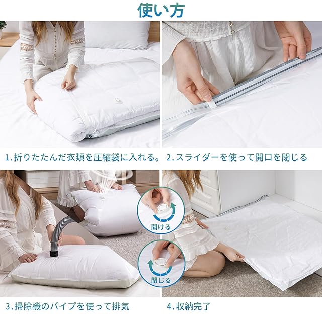 注意事項:最適な圧縮効果を得るために、圧縮袋を使用する際には、アイテムが完全に乾燥して清潔であることを確認してください。できるだけ袋内の空気を排出し、スライダーをしっかりと密閉してください。また、圧縮袋は壊れやすいまたは鋭利なアイテムの保管には適していませんので、袋が損傷することがありませんようにご注意ください。収納アドバイスに従い、圧縮袋を正しく使用して、最適な収納効果とアイテムの保護を実現してください