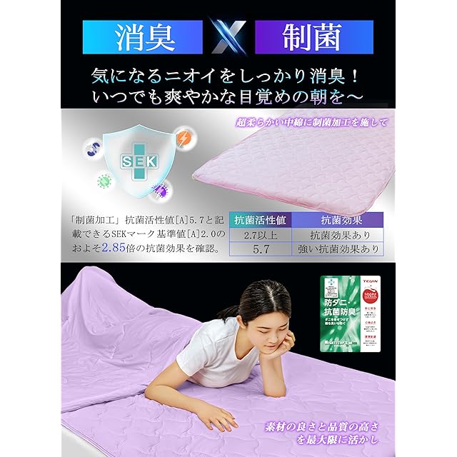❄【抗菌防臭ケア!】弊社工場の熟練職人が考案した超柔らか中綿構造の冷感敷きパッド。これまで自信をもっておすすめしてきましたが、今回はさらに中綿に「SEK加工(抗菌・防臭加工)」を施しました。ふわふわ感はそのままに、機能性を大幅に向上させ、素材の良さと品質の高さを最大限に活かしています。これにより、より安心で清潔、快適にお使いいただける敷きパッド 夏用が完成しました。