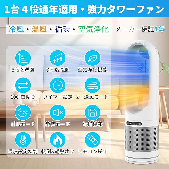 【2025最新進化・冷暖両用・空気清浄】扇風機 タワーファン 空気清浄機 【花粉&ペットの毛&ニオイ対策】羽なし扇風機 8段階冷風・3段階暖風切替 大風量100°左右首振り 9H切タイマー DCモーター 静音省エネ節電 リモコン付 転倒過熱OFF セラミックヒーター 衣類乾燥 四季適用 サーキュレーター 部屋 スリム型 リビング 脱衣所 会議室 室内など対応 PSE認証済 日本語説明書 ホワイト