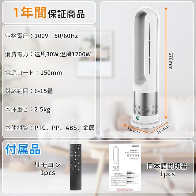 商品名:【 2025新進化・冷暖兼用・DCモーター 】タワーファン 羽なし扇風機 タワーファン温風 冷風 8段階送風/3段階温風 100°左右首振り 9Hタイマー リビング扇風機 強風&微風&静音モード 大風量 熱中症対策 羽根なし リモコン付 省エネ 節電 転倒&過熱OFF 足元 セラミックヒーター 子供部屋/脱衣所/トイレ/キッチン/寝室/リビンク/書斎/ペット用 PSE認証済 日本説明書 ホワイト