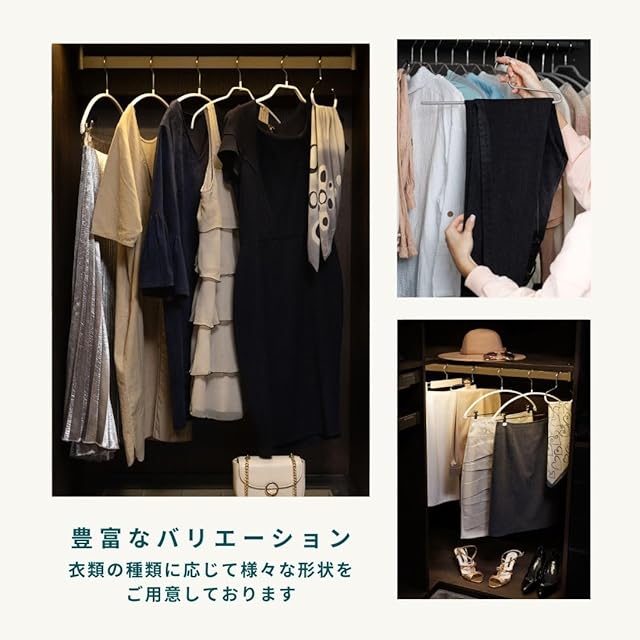 【すべらない】スチール製のハンガー本体はPVC樹脂で特殊コーティングが施され、掛けた衣類が滑り落ちません。人体のラインに合わせた立体構造のため、滑り落ちやすいカーディガンやニットも型崩れなく収納できます。