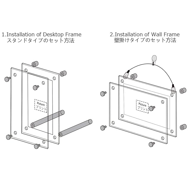 2.【壁掛け方&机置き方】:縦置きか横置き、フレームを支えてる支柱の位置を変えると置き方が変えられます。ワイヤーをフレームに装着すると壁に掛ける事が出来ます。