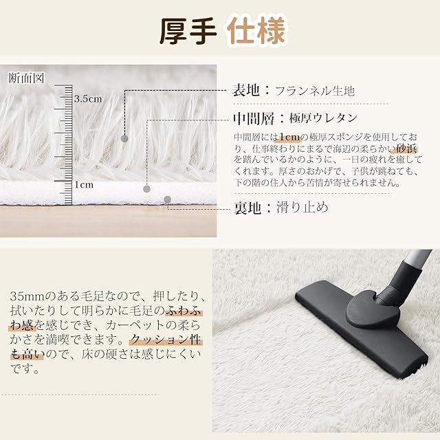 【厚手仕様カーペット】サイズ:120×160cm 一畳 表地:ポリエステル100% 35mm 中間層:ウレタンフォーム約10mm 裏面:不織布(滑り止め加工)約2mm 重量:約1.4kg