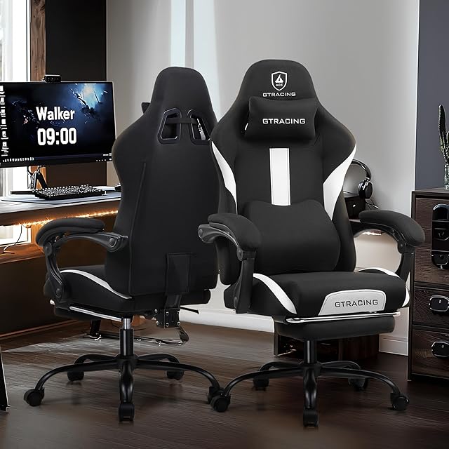 GTRACING ゲーミングチェア ファブリック デスクチェア 人間工学設計 腰痛対策 ポケットコイル 90°~150°リクライニング [一体式オットマン付き] 連動式アームレスト 蒸れない 高背もたれ ヘッドレスト&ランバーサポート 通気性メッシュ 高耐久性 GT905-Black