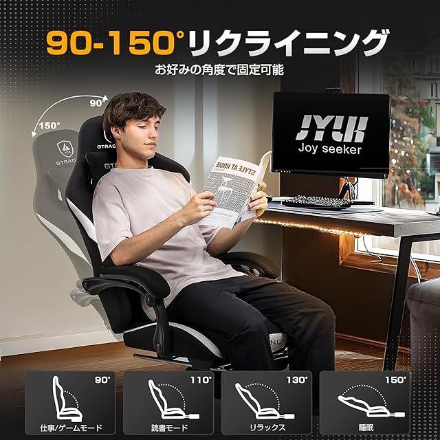 【カスタマイズ可能な快適さ】10cmの高さ調整、90°~150°のリクライニング機能、そして引き出し式オットマンを搭載しており、このゲーミングチェアはさまざまな身長や好みに合わせて調整可能。どんな姿勢でも快適にリラックスできる設計です。