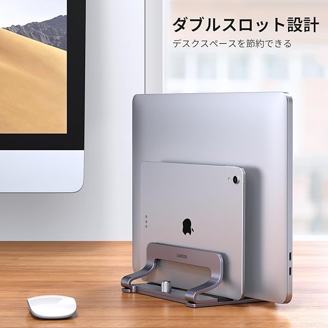 商品名:UGREEN ノートパソコンスタンド 縦型 2台収納 pcスタンド 縦置き 収納 2スロット 幅調整可能 2槽 アルミ合金製 シリコーンゴム傷防止 15.6インチまで対応 パソコンスタンド 全機種対応MacBook Pro Surface iPad HP Lenovo ThinkPad など