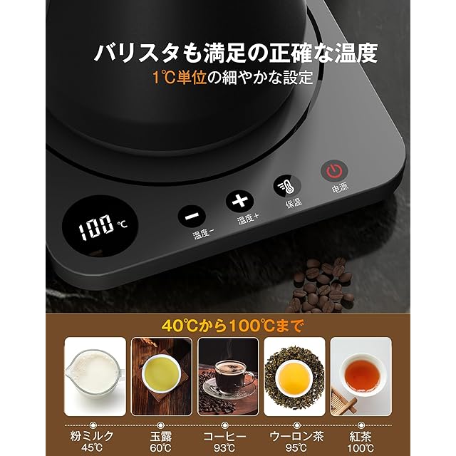 【1℃刻みで温度設定&30分保温】こまめに温度調節可能、精度1℃まで。湯沸かしケトル調節範囲:40〜100℃、調節範囲で色々設定可能。30分保温、ワンタッチで恒温に切り換えます。