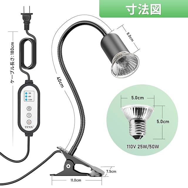 商品名:TFNN 爬虫類ライト UVA+UVB 紫外線ライト 亀ライト 保温電球 バスキング ライト 光量調節コード 無段階調光 タイマー機能 アナログ太陽 角度調節 爬虫類 両生類用ライト