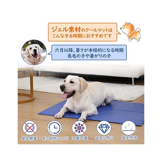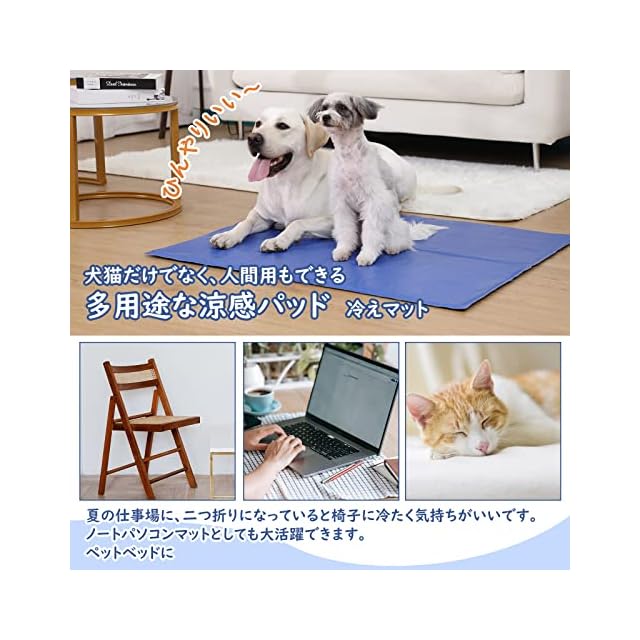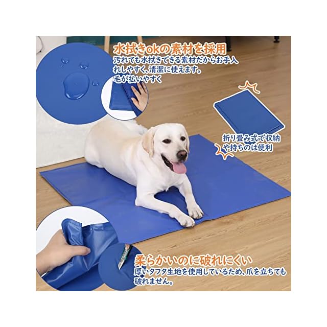 防水材料使ってるので、お手入れが簡単になります<br> 万が一ペットがおしっこ漏れたとしても、防水材料なので、中に染み込みません、固く絞った濡れた雑巾などでさっと拭くだけ。<br> 中のジェルの材質は高分子吸水性ポリマーです、冷蔵庫に入れなくても冷んやり(入れるとより冷んやり)冷却パッドの中にはジェル材質なので、予め冷やす必要もありません、冷蔵庫に入れなくても冷んやり(入れるとより冷んやり) 。そのまま使えて、汚れた時は水拭きでサッとふくだけ。<br> 犬猫だけでなく、人間用もできる多用途な涼感パッド 冷えパッド!<br> * 夏の仕事場に、二つ折りになっていると椅子に引っ掛けて背中に当てているとかなりひんやりと冷たく気持ちがいいです。<br> * 人間の夏の足元パッドやオフィス椅子用パッド、車席のパッド、パソコンパッドとしても大活躍できます。色んな場合に簡単に使える夏のひんやりグッズ。