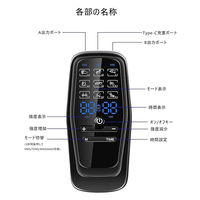 注意:製品は内蔵バッテリーですので、乾電池を使用することはできません。そのため、バッテリーボックス部分は粘着されています。無理に開けないでください。製品はType-C充電式で、パッケージに充電ケーブルが含まれています。。。。 使い方簡単:モードの選択、レベル、時間などの画面がディスプレイに表示され、見やすくて使い簡単です。20分操作しないと自動的に電源が切られ、初めての方でもご安心使用していただけます。