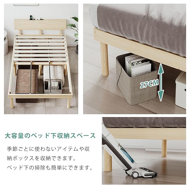 [SuperKois] ベッド ベッドフレーム シングル 宮棚 2口コンセント すのこベッド シングルベッド ベット 天然無垢パイン 頑丈 耐荷重200kg 静音 湿気対策 ローベッド ナチュラル