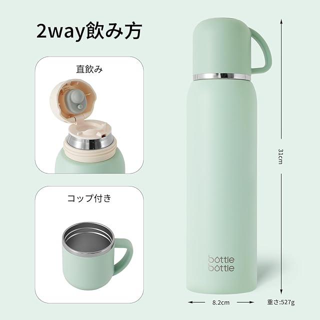 BOTTLE BOTTLE 水筒 1リットル コップタイプ 2ウェイボトル 真空断熱 ステンレス ボトル 保温 保冷 マグボトル 2way 直飲み コップ飲み カバー付き グリーン
