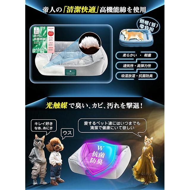 ❄【W抗菌防臭で清潔な眠りを守る】犬 ベッドの中綿には抗菌防臭加工を施し、細菌の繁殖を効果的に抑制。接触面の冷感生地には光触媒加工を採用しています。昼間の陽光や夜間の照明をエネルギーに変え、付着した有機物を酸化分解する自浄機能で、抗菌・防汚・消臭を実現。高温多湿の夏場でも、内側から外側まで二重の抗菌バリアが、ペットの健やかな眠りを清潔に守ります。まさに高級ペット用品が備えるべき品質と性能で、大切な家族の健康を紡ぎます。