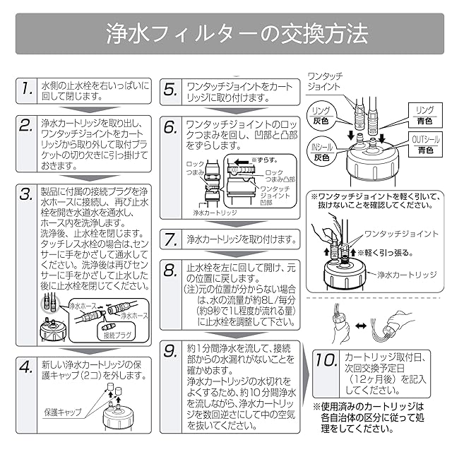 大容量設計と抗菌セラミック技術により、カートリッジの寿命が約12ヶ月(1日使用量25L換算)と延長され、頻繁な交換の手間が軽減され、経済的で環境にも優しい製品です。