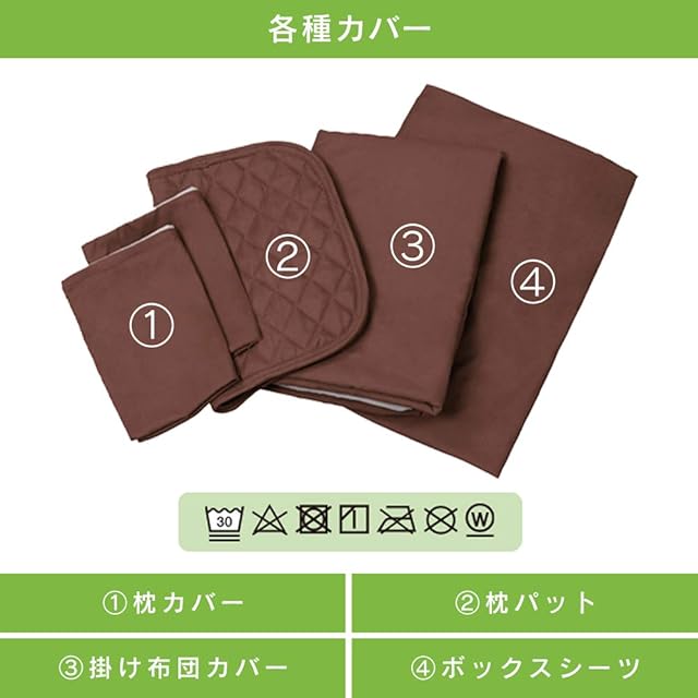 お手入れ方法:掛け布団カバー、ボックスシーツ、枕カバー、枕パッドは洗濯可能。他は洗濯不可。
