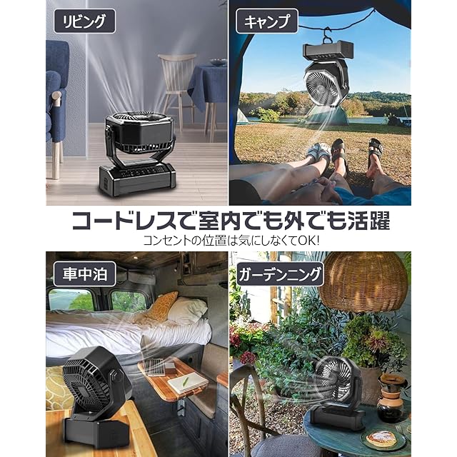 商品名:【自動首振り&20000mAh】 扇風機 キャンプ アウトドア 充電式ファン 充電式扇風機 コードレス リモコン付き 切タイマー ポータブル 小型 屋外 サーキュレーター 二重反転ファン 風力4段階 LEDライト 吊り下げ 強力送風 暑さ対策 アウトドア用 災害対策 ブラック