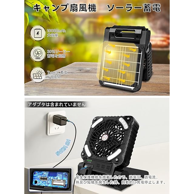 商品名:キャンプ 扇風機 ソーラー扇風機 5200mAh 大容量 ソーラーパネル キャンプ用品 Type-C充電 タイマー機能 風量4段階調節 LED輝度3段階調節 モバイルバッテリー機能 車中泊 防災 ライト アウトドア携帯キャンプ用品/応急 防災 停電用 日本語説明書付