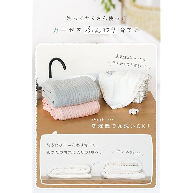 【洗濯するたびにふわっふわ】このガーゼケットの魅力は、使うほどにふわふわ感が増すこと!特別なウォッシュ加工が施されているため、毎回洗うたびに柔らかさがアップし、もこもこした心地よい肌触りに。生地に伸縮性が加わり、さらに快適な寝心地をサポートします。シングルサイズのこのアイテムで、毎晩とろけるような眠りを体感してください!