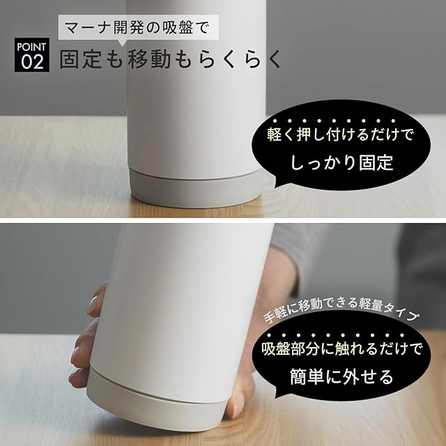 【固定も移動もラクラク】マーナが開発した「RIPITA(リピタ)吸盤」。軽く押し付けるだけでしっかり固定できて、吸着部分に触れるだけで簡単に外せるフレキシブルな吸盤です。【設置できる素材】光沢のある平らな面でステンレス・透明ガラス・金属塗装面等【設置できない素材】凹凸、ザラザラ、艶消し面やコンクリート、コーティングされていない木面等【ご注意】取り付け面と吸盤部分の汚れ・水分・油分等をキレイに拭き取ってから吸着させてください。フタの開きが弱い場合は、一度シリコーンパーツを外し、再度組みなおしてください。