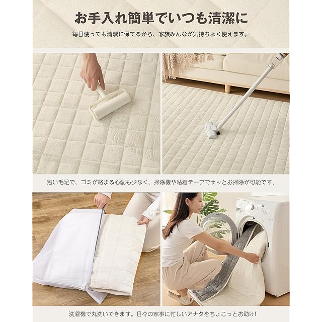 【掃除も楽々】毛足が短いのでゴミが絡まる心配も少なく、掃除機や粘着テープでサッとお掃除が可能です。ご家庭の洗濯機でまるっと洗えてお手入れ簡単です。フランネルキルトラグは軽く取り扱いが簡単、移動や収納も楽々です。