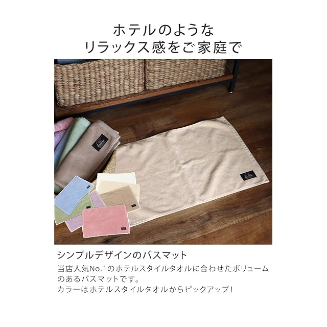 ボリュームのあるリッチな風合いとシンプルデザインのホテル仕様バスマットです。<br>ニオイのもととなる繊維上の菌の増殖を抑制し、安心して清潔にご使用いただけます。<br>また、滑り止めゴムがないシンプルなマットだから、洗濯機で気軽に洗えて毎日清潔に使えます。<br><br>【お洗濯のご注意】<br>お買いになられたタオルは一度、お洗濯をされてからお使いください。<br>初めのうちは毛羽落ちしやすいため、単独でのお洗濯をおすすめします。<br>乾燥機のご使用は、タオルへの負荷がかかり、痛みを促進してしまう恐れがあります。その結果、毛羽落ちも多くなってしまうことに繋がります。<br>毛羽落ちを軽減して長くご愛用して頂くためにはお日様で干し、柔軟剤は毛羽落ちが治まってから、標準量を守ってお使いくださいますことをおすすめいたします。<br><br>【ドラム式洗濯機の注意】<br>ドラム式洗濯機をご使用の場合、タオルの風合いが悪くなったり、毛羽落ちしやすくなる場合があります。<br>ご使用のドラム式洗濯機取扱説明書をご確認の上、お洗濯ください。<br>