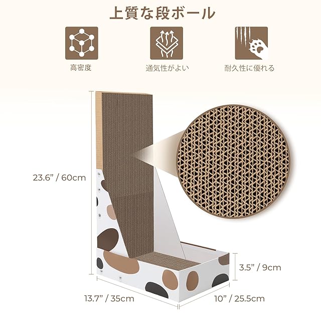 「製品仕様」L字型25.5*35*60cm(縦*横*高さ)。パッケージには耐久性のある両面使える猫爪研ぎが三枚含まれています。ネジも付いており、組み立てが簡単で、子猫や成猫までに使用することができます。