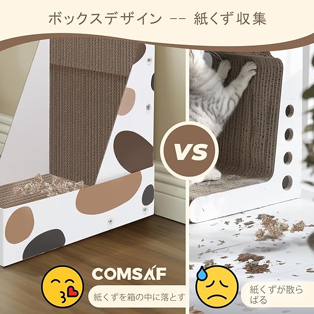 「清掃しやすい」:紙製ボックスの設計は、紙くずを集めることを目的としていますので、猫がかき落としたくずが床一面に散らばってしまう心配はありません。この細やかな設計により、あなたの家が清潔で整然とした状態を保つことができます。