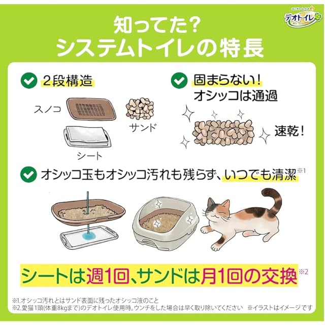 【消臭・抗菌サンドの特徴】<br>※システムトイレ用の固まらないサンドです<br> オシッコを残さない撥水サンド<br> ニオイ菌99.9%抑制※1<br> 飛び散らない※2<br> 1カ月交換不要※3<br> <br> 【針葉樹タイプ】<br> 天然木※4で消臭<br> 燃やせる自然素材※5<br> <br> 【緑茶成分入りタイプ】<br> 燃やせる自然素材※5<br> 天然緑茶成分入り<br> <br> 【ふんわり香るタイプ】<br> 砂かきで香る<br> ナチュラルグリーンの香り<br> ホワイトフローラルの香り<br> <br> <br> ※1 ニオイ菌とは尿からアンモニアを発生させやすい菌のこと。<br>第三者機関による抗菌性試験結果。<br>すべての菌を抑制するわけではありません<br> ※2 デオサンド オシッコのあとに香りで消臭する砂 比<br> ※3 愛猫1頭(体重8kgまで)のデオトイレ使用時。<br>ウンチをした場合は早く取り除いてください<br> ※4 植林した木の端材を使用<br> ※5 居住地域のルールに従って処理してください<br> <br><br> 【シートの特徴】<br> 超吸収タイプ<br> ニオイ菌99.9%抑制※1<br> 銀イオン配合 1週間交換不要※2<br> <br> ※1 ニオイ菌とは尿からアンモニアを発生させやすい菌のこと。<br>第三者機関による抗菌性試験結果。<br>すべての菌を抑制するわけではありません<br> ※2 愛猫1頭(体重8kgまで)のデオトイレ使用時。<br>ウンチをした場合は早く取り除いてください。<br> <br> 【ご注意】 <br> デオトイレの専用品以外のものをお使いいただいても、消臭・抗菌の性能が十分に発揮できないばかりか、尿モレなどのトラブルの原因となります。