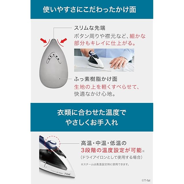 素材に合わせた適切な温度でアイロンがけできる3段階の温度調節機能(低温~高温)