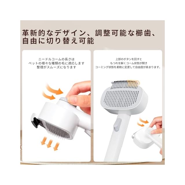 【人間化されたアップグレードされたデザイン】——調整可能な櫛の歯と調整可能なピン櫛の長さを備えた革新的なデザインにより、さまざまなペットの毛のタイプに適応し、コーミングが簡単になります。ワンタッチ脱毛ボタン、押すと絡まった毛が排出され、掃除がより便利になります。あなたのペットの毛がもつれる悩みから解放され、絹のように滑らかなコーミング体験をお楽しみください。日常のお手入れでも、換毛期のお手入れでも、この2in1コームはあなたの右腕となり、ペットの毛を健康で滑らかにし、抜け毛の悩みを軽減し、まさに「スムーズにコーミングして、心地よく甘やかす」ことを実現します。